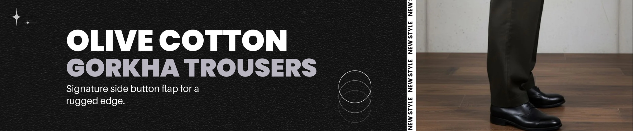 The trousers feature a clean straight-leg silhouette, double front pleats, and the signature Gorkha side flap button, giving them a unique and premium touch.